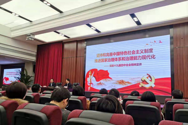 郑向东根据中央有关精神,结合自己的学习与思考,重点宣讲了五个方面的内容:一是党的十九届四中全会取得重要成果,影响十分深远;二是充分认识坚持和完善中国特色社会主义制度、推进国家治理体系和治理能力现代化的重大意义;三是深刻领会中国特色社会主义制度和国家治理体系的显著优势,坚定中国特色社会主义制度自信;四是关于《决定》提出的总体要求、总体目标和重点任务;五是贯彻落实全会精神的要求。