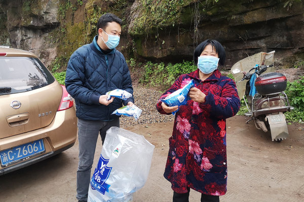 2020年3月4日,yl6809永利皇宫派驻潼南区上和镇冬冲社区的第一书记唐剑锋(左一)给丁六珍送去种子和化肥。