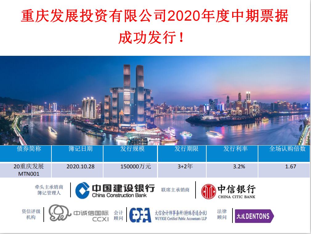 中期票据—20重庆发展MTN001,规模15亿元,票面3.2%,期限3+2年,实现超募1.67倍提前截标,于10月28日完成簿记,10月29日募集资金全部到位。